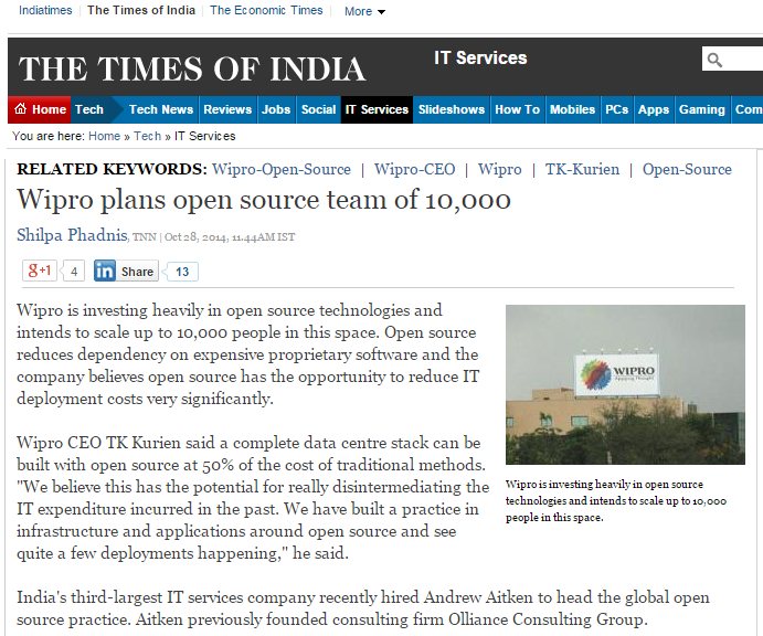 TK Kurien, CEO of Wipro believes that a complete data centre stack can be built with open source at a cost that is half of the cost utilized in traditional methods. He was quoted saying, “We believe this has the potential for really disintermediation the IT expenditure incurred in the past. We have built a practice in infrastructure and applications around open source and see quite a few deployments happening.”